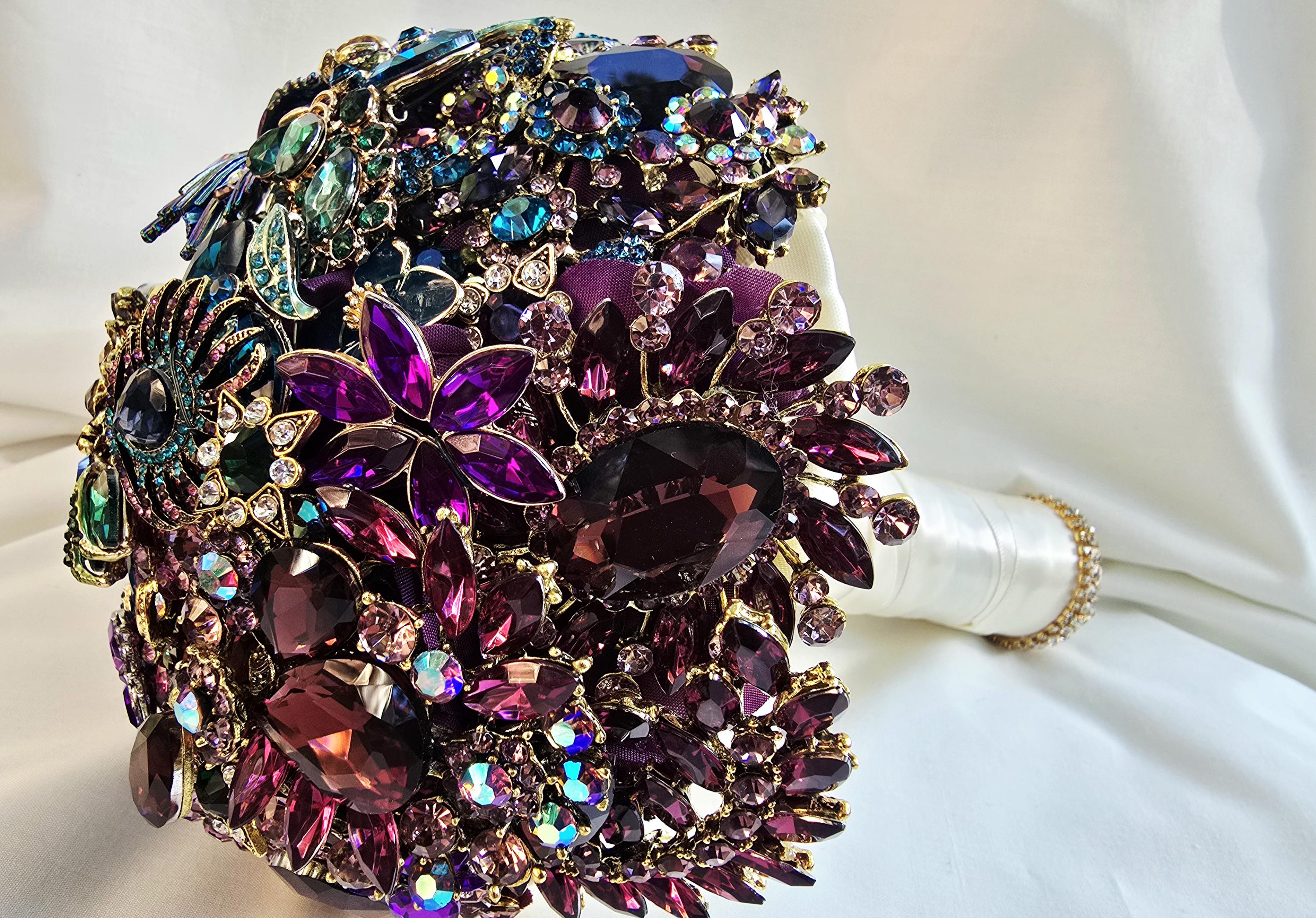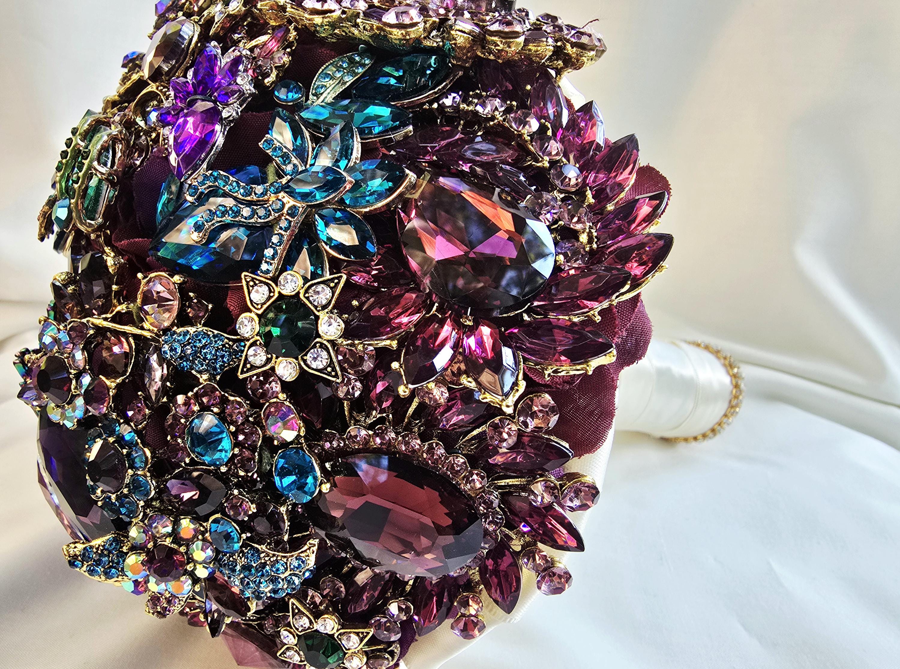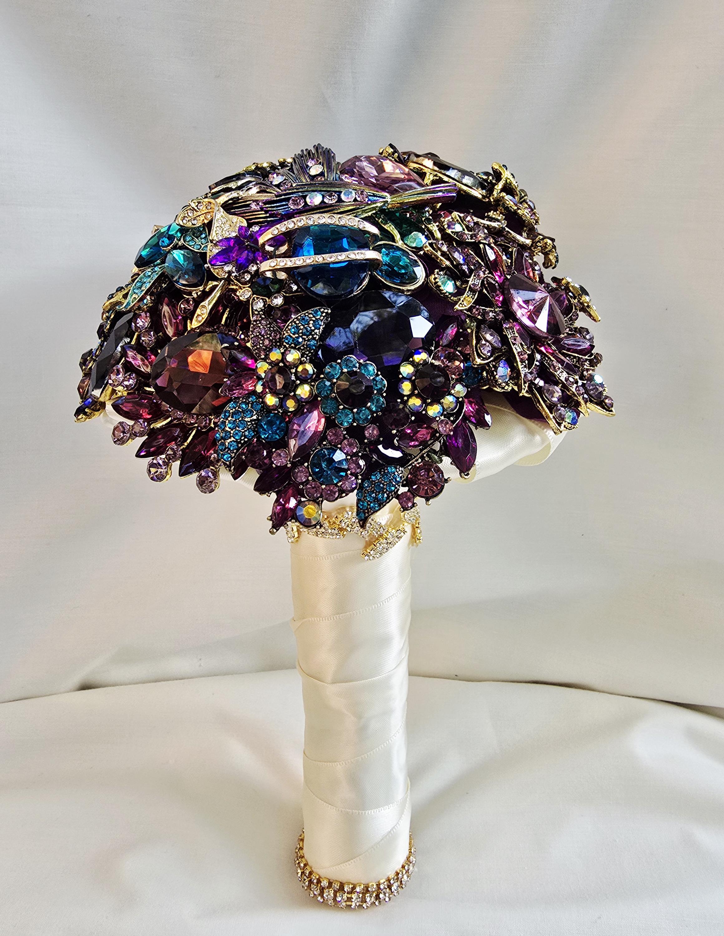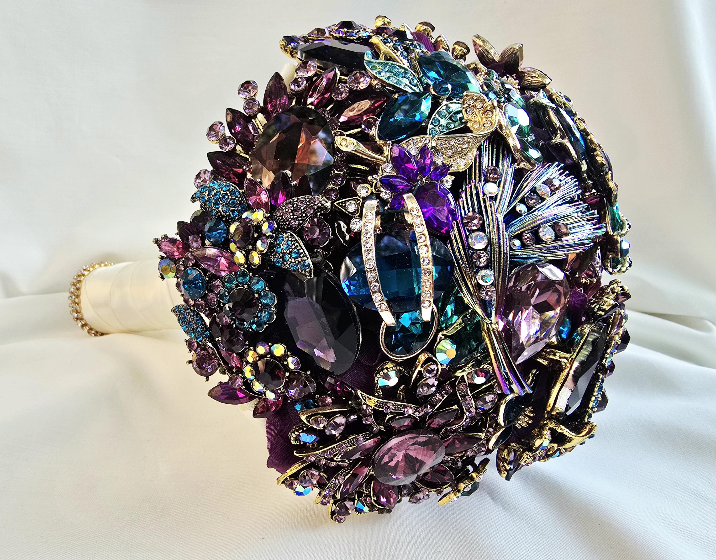 This listing is for a 9 inch bridal brooch bouquet in shades of deep purple, aubergine, teal and turquoise blue and emeral green, accented in gold. Thos bouquet is sold as pictured in the photos of this listing.