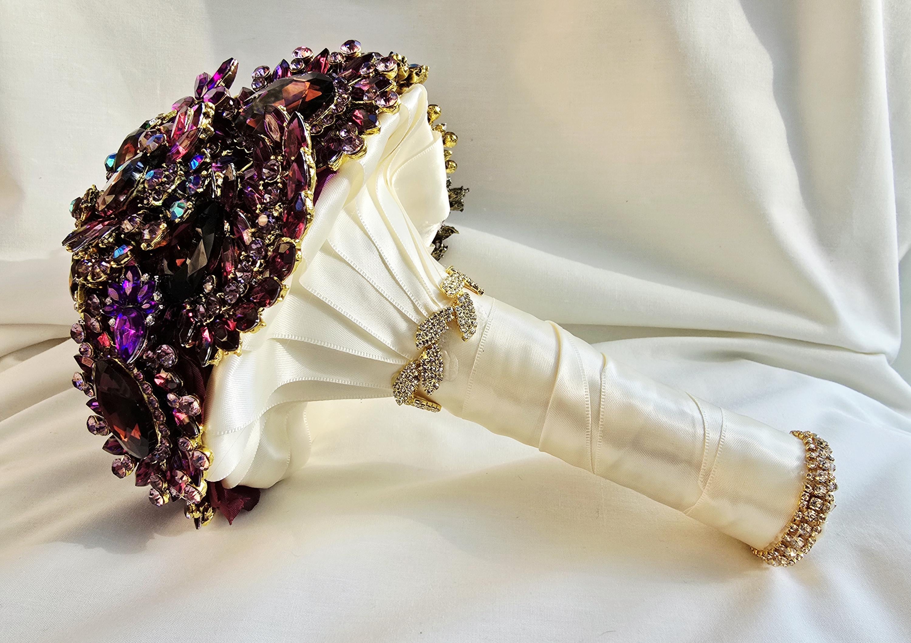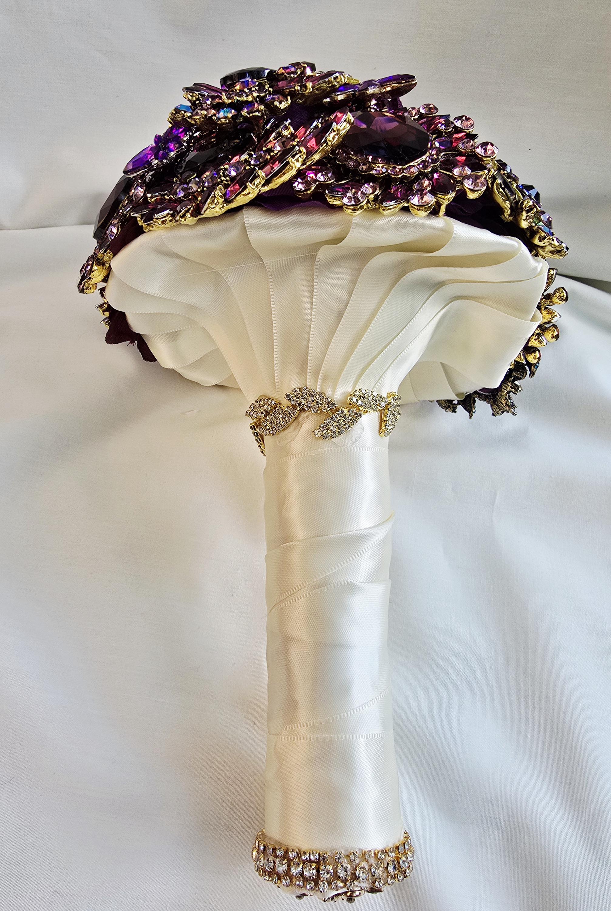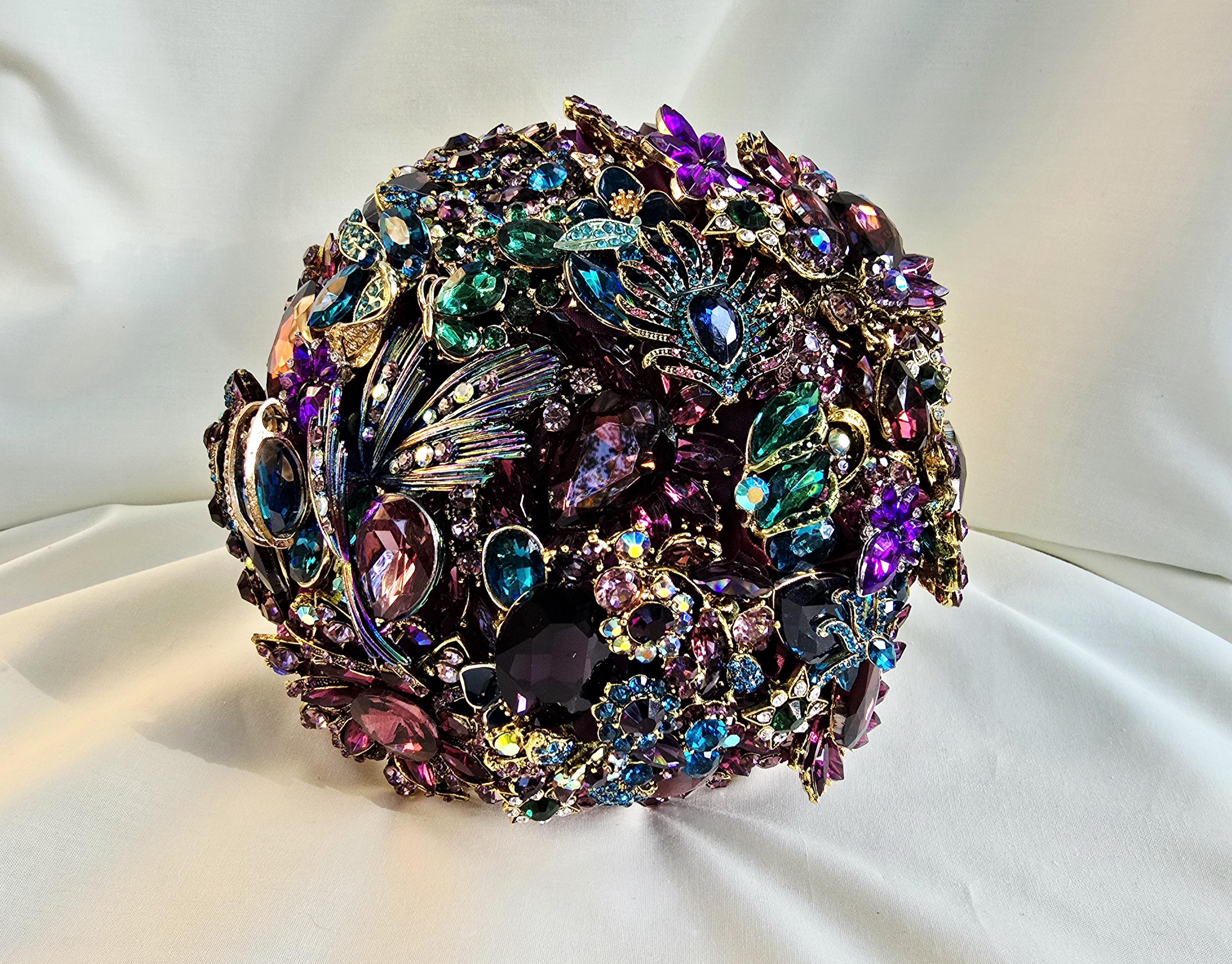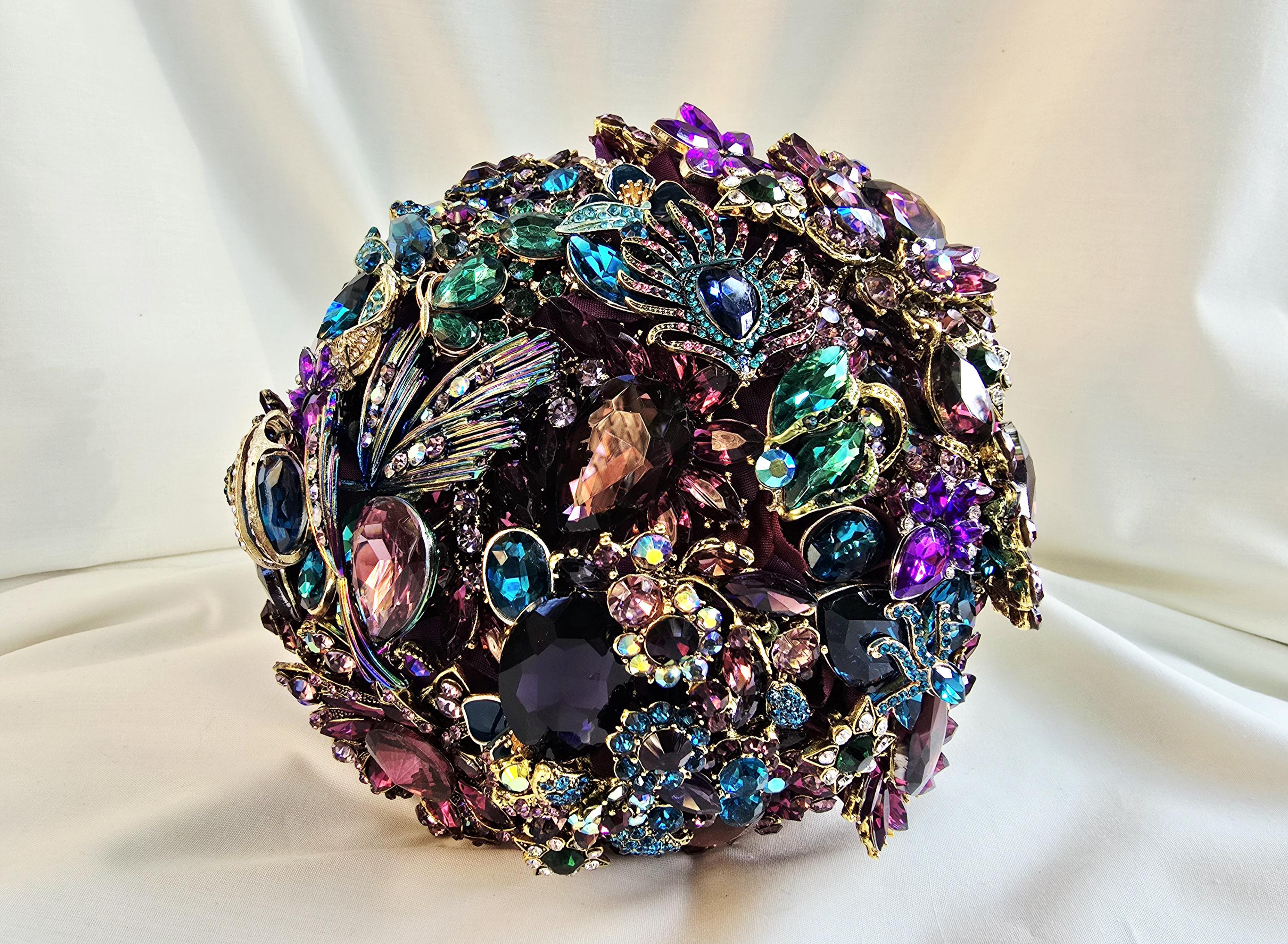 This listing is for a 9 inch bridal brooch bouquet in shades of deep purple, aubergine, teal and turquoise blue and emeral green, accented in gold. Thos bouquet is sold as pictured in the photos of this listing.