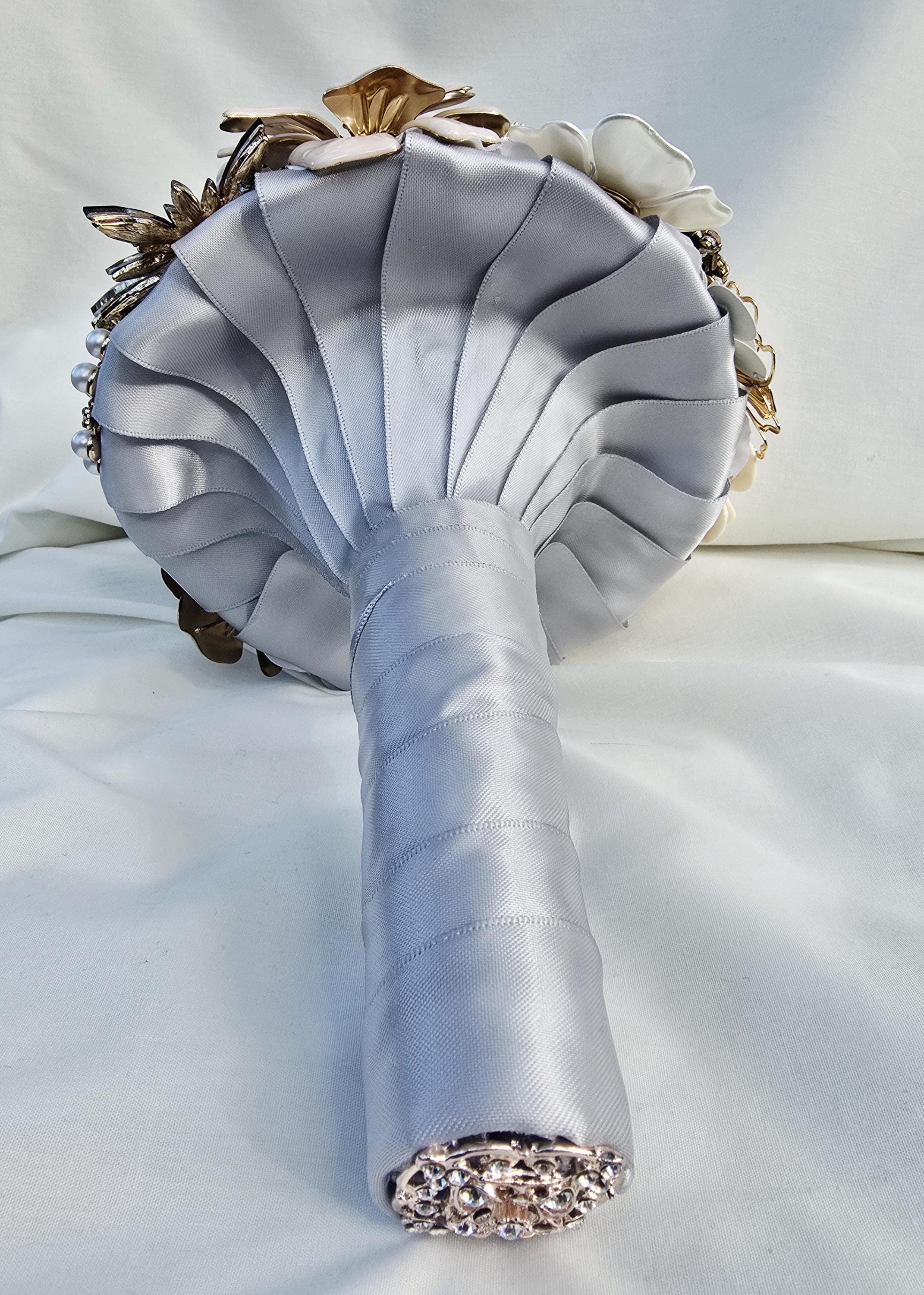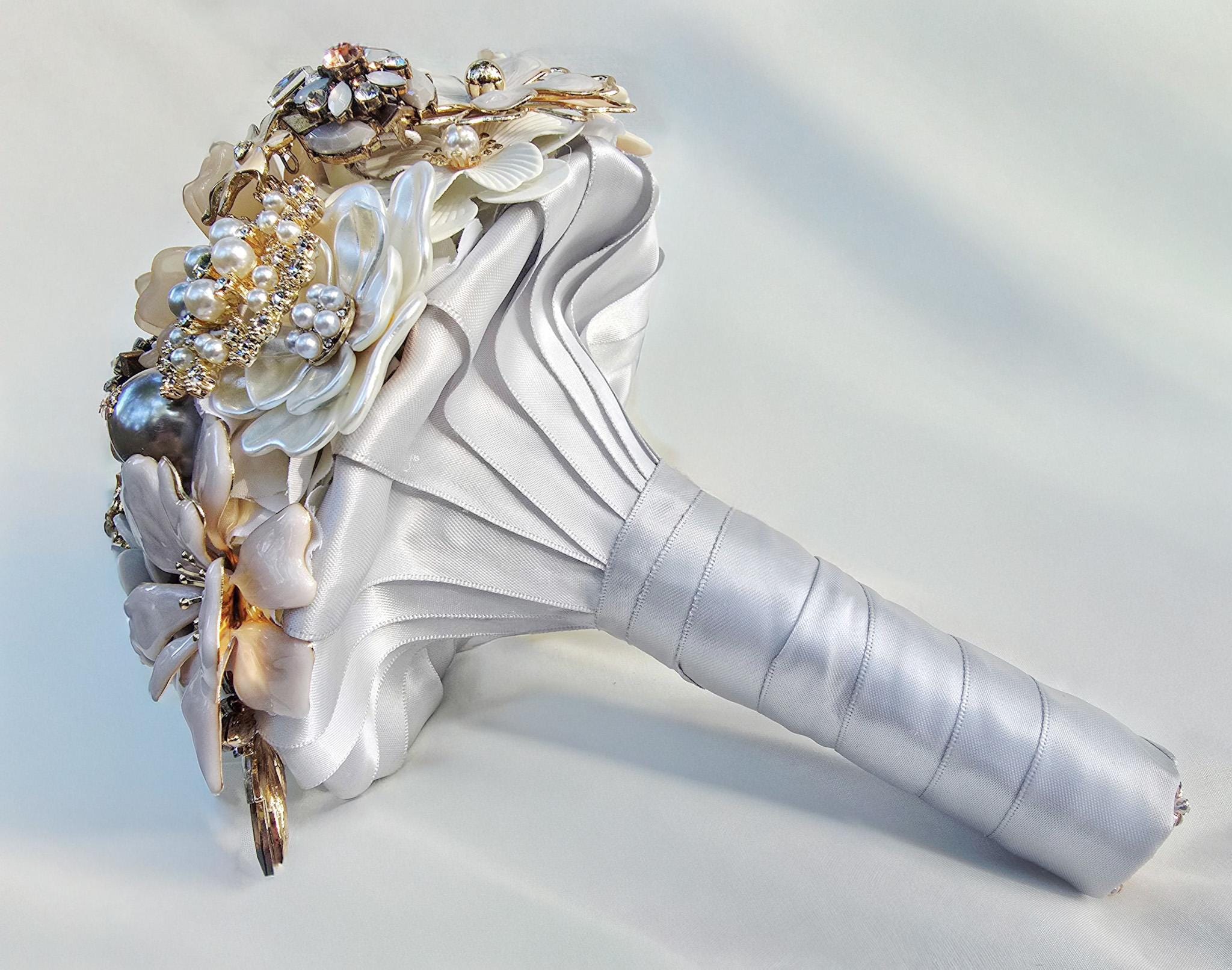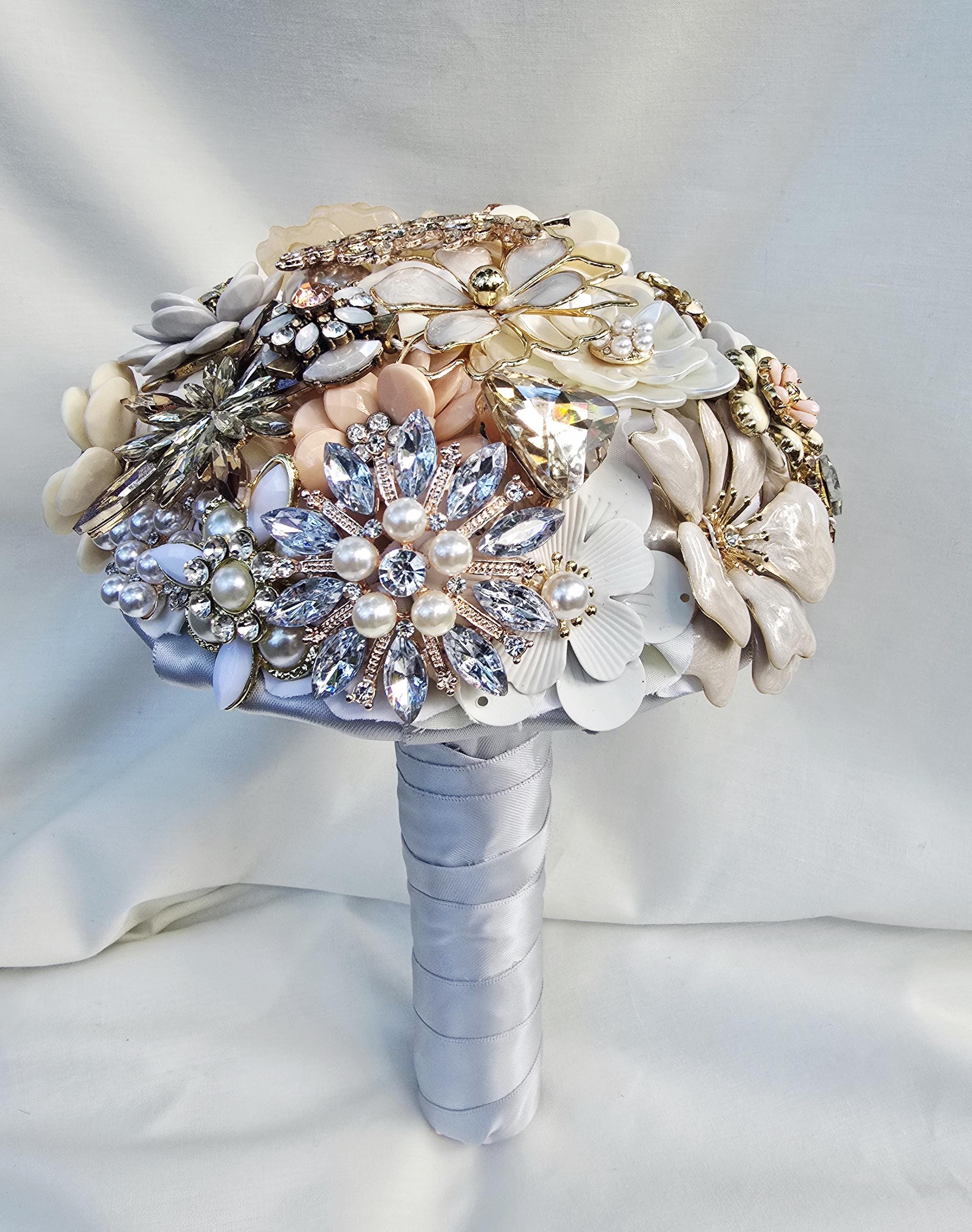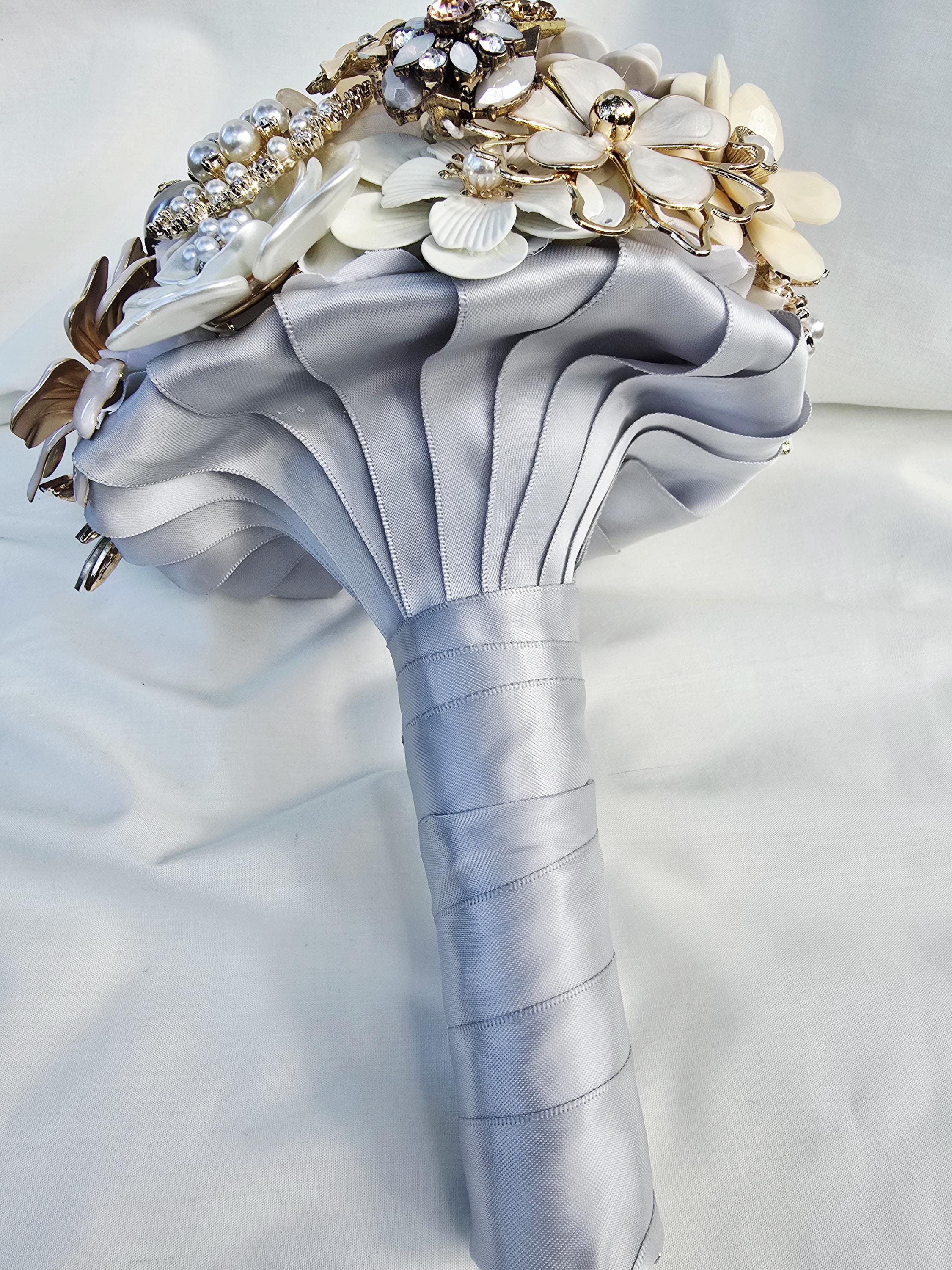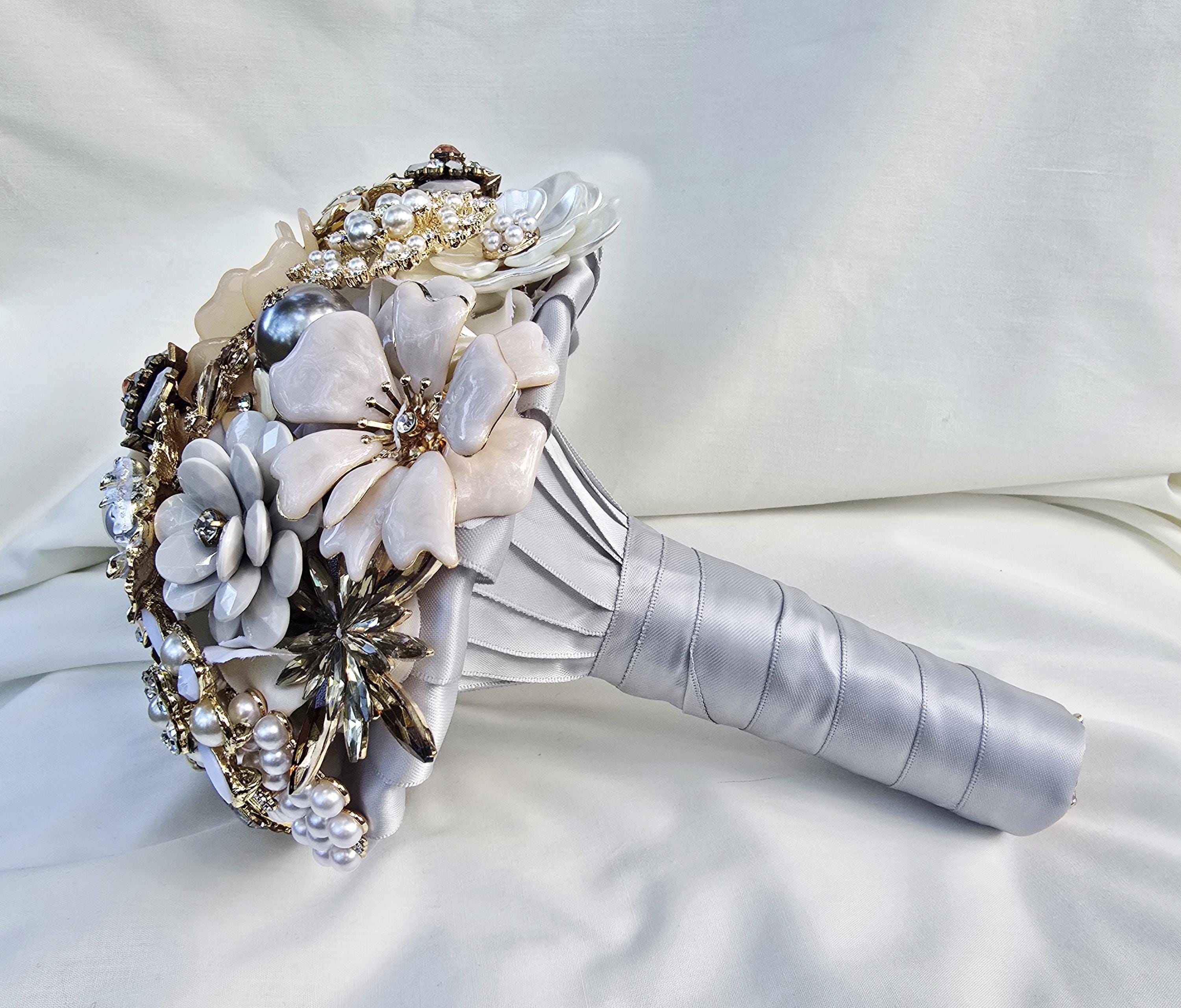 This elegant handmade bouquet is crafted with brooches and jewels in shades of light gray, ivory and cream, gold, rose gold and champagne. The bouquet handle is wrapped in sleek light gray ribbon and finished with a sparkly rhinestone brooch.